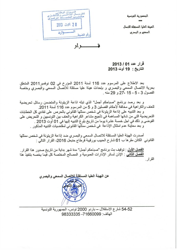 إيقاف برنامج “صباحك أجمل” على إذاعة الزيتونة لمدة شهر