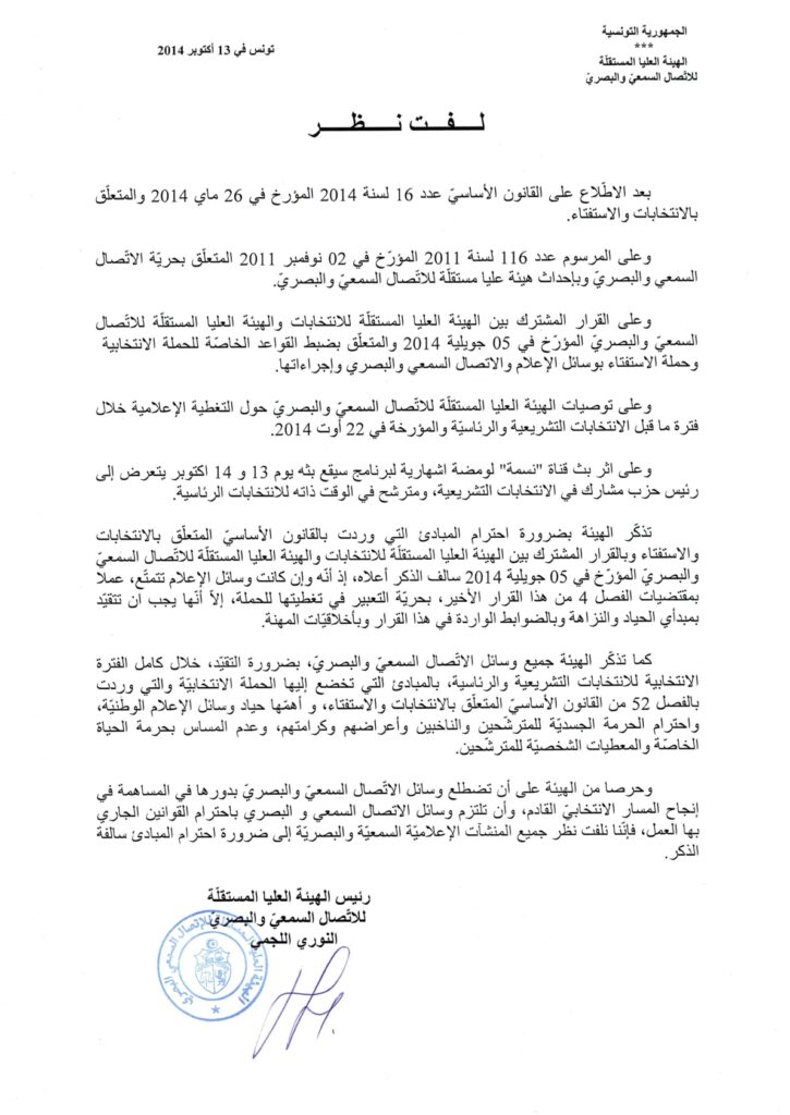 الهيئة توجه لفت نظر لقناة نسمة من أجل مخالفة القانون الانتخابي 13/10/2014 admin-haica by قرارات in 28/01/2026