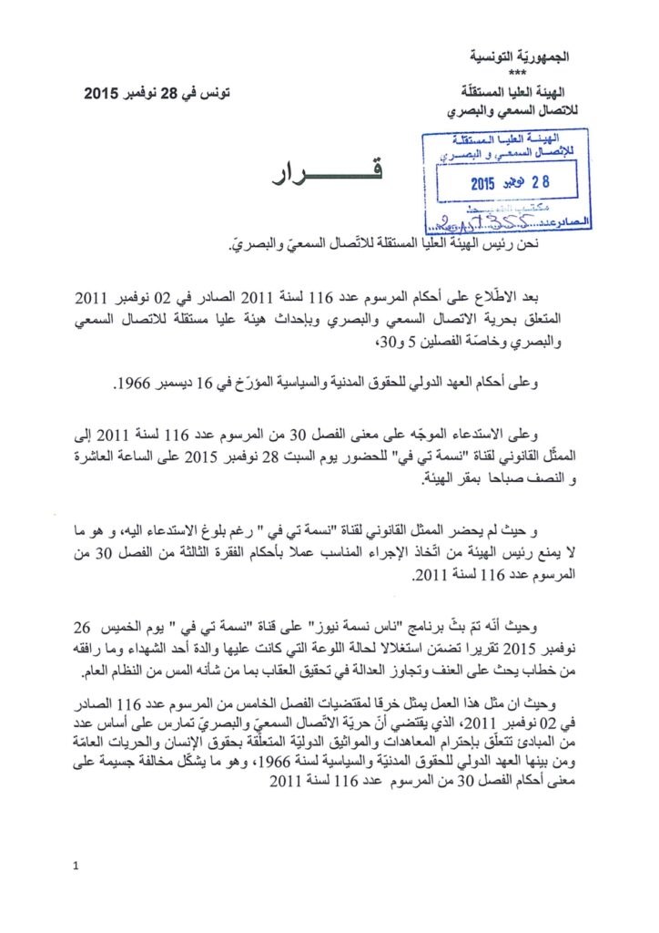 رئيس الهيئة يقرر إيقاف إعادة بث برنامج “ناس نسمة نيوز” لإثارة البلبلة والفزع في صفوف المواطنين 28/11/2015 admin-haica by قرارات in 30/01/2026