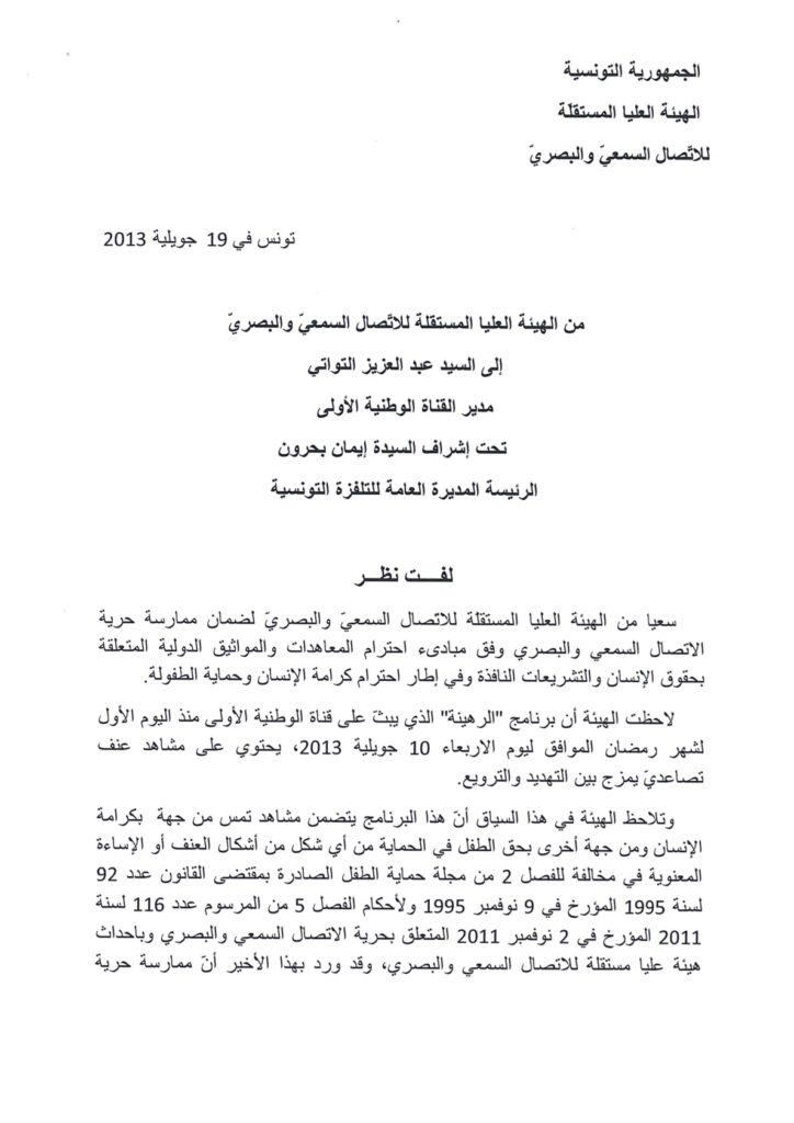 الهيئة توجه لفت نظر للقناة الوطنية الأولى بخصوص برنامج “الرهينة” 19/07/2013 admin-haica by قرارات in 28/01/2026