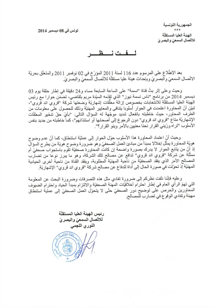 الهيئة توجه لفت نظر لقناة نسمة بخصوص برنامج “ناس نسمة نيوز” من أجل مخالفة القانون الانتخابي 08/12/2014 admin-haica by قرارات in 28/01/2026