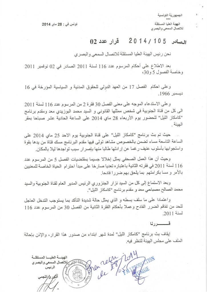 الهيئة تقرر إيقاف برنامج “كاميكاز الليل” على قناة الجنوبية لمدة شهر 28/05/2014 admin-haica by قرارات in 29/01/2026