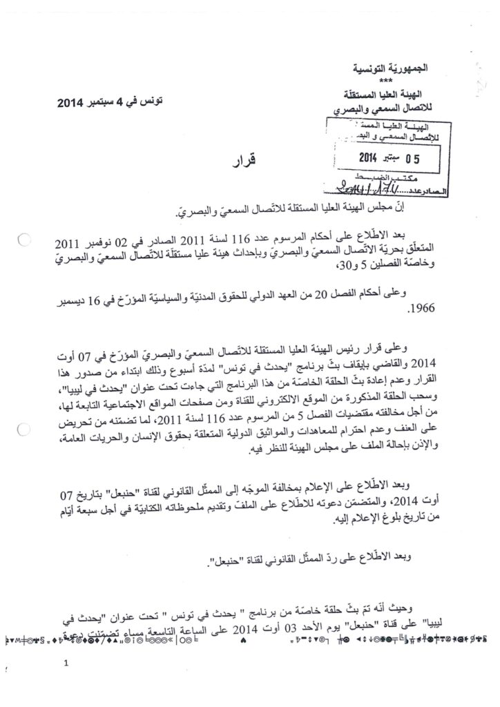 الهيئة تقرر إيقاف بث وإعادة بث برنامج “يحدث في تونس” لمدة أسبوع 04/09/2014 admin-haica by قرارات in 29/01/2026