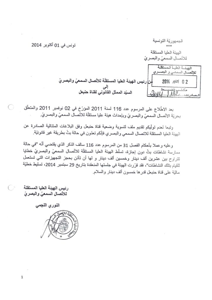 خطية مالية بـ50 ألف دينار ضد قناة حنبعل من أجل البث دون إجازة 01/10/2014 admin-haica by قرارات in 29/01/2026