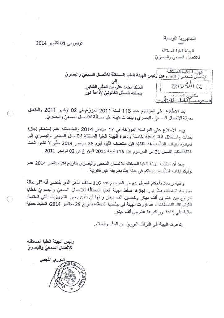 خطية مالية بـ20 ألف دينار ضد إذاعة النور من أجل البث دون إجازة 01/10/2014 admin-haica by قرارات in 29/01/2026