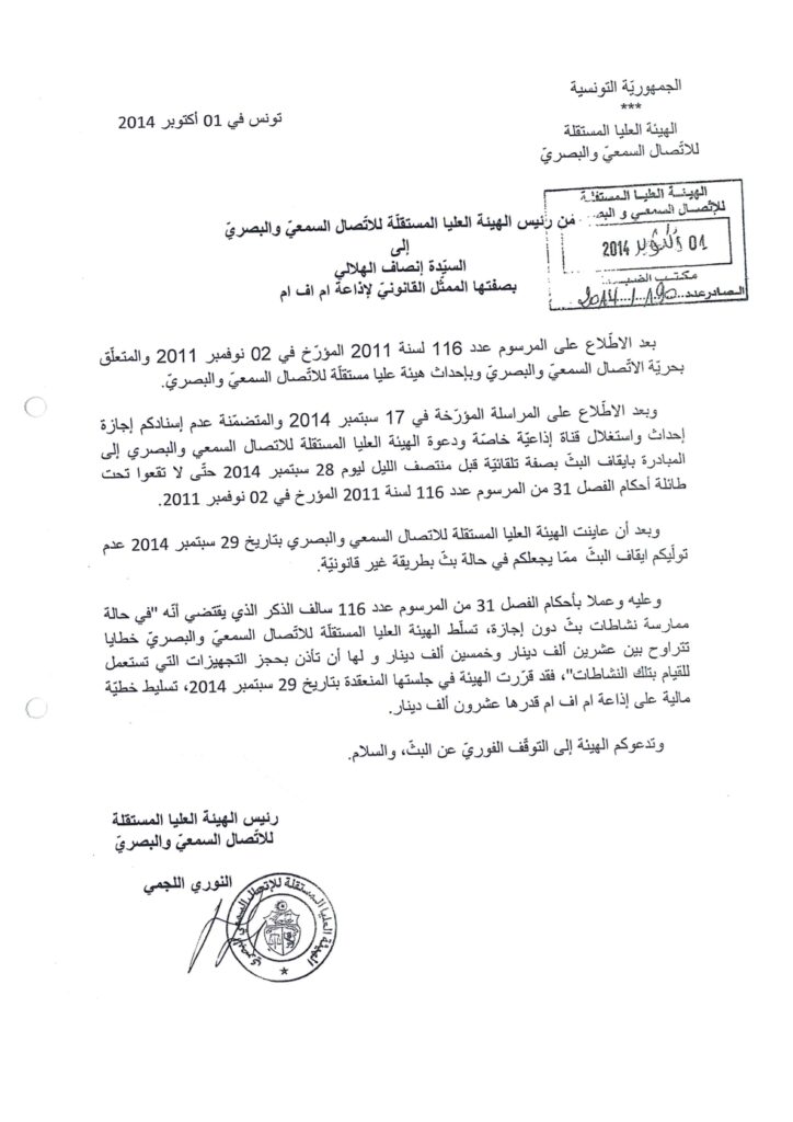 خطية مالية بـ20 ألف دينار ضد إذاعة أم أف أم من أجل البث دون إجازة 01/10/2014 admin-haica by قرارات in 29/01/2026