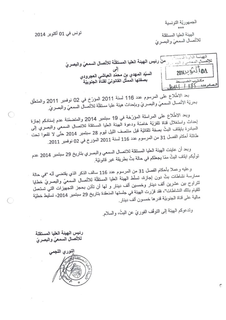 خطية مالية بـ50 ألف دينار ضد قناة الجنوبية من أجل البث دون إجازة 01/10/2014 admin-haica by قرارات in 29/01/2026