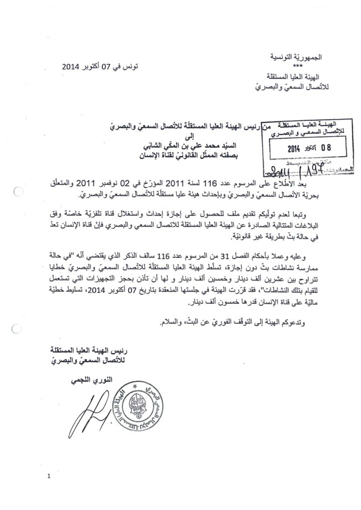 خطية مالية بـ50 ألف دينار ضد قناة الإنسان من أجل البث دون إجازة 07/10/2014 admin-haica by قرارات in 29/01/2026