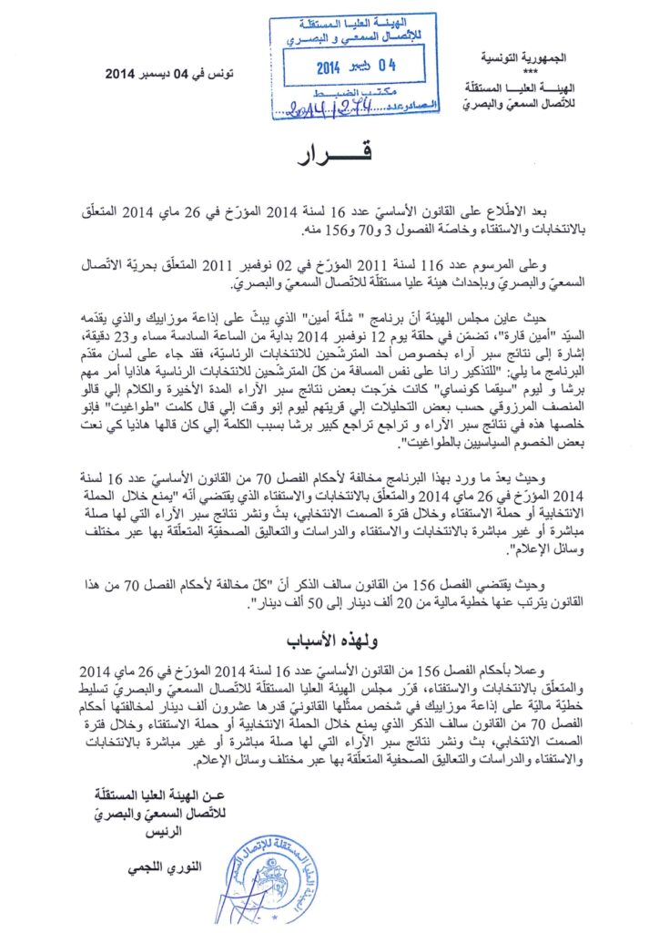 خطية مالي بـ20 ألف دينار ضد موزاييك أف أم من أجل مخالفة القانون الانتخابي 04/12/2014 admin-haica by قرارات in 29/01/2026
