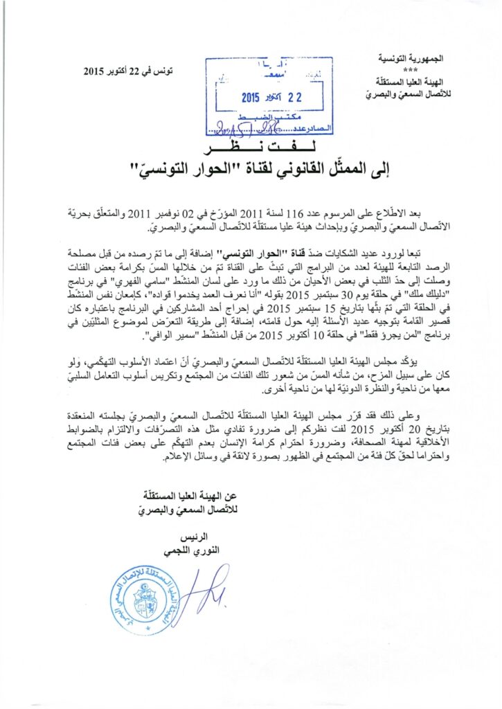 الهيئة توجه لفت نظر لقناة الحوار التونسي بخصوص برنامج “دليلك ملك” 22/10/2015 admin-haica by قرارات in 29/01/2026