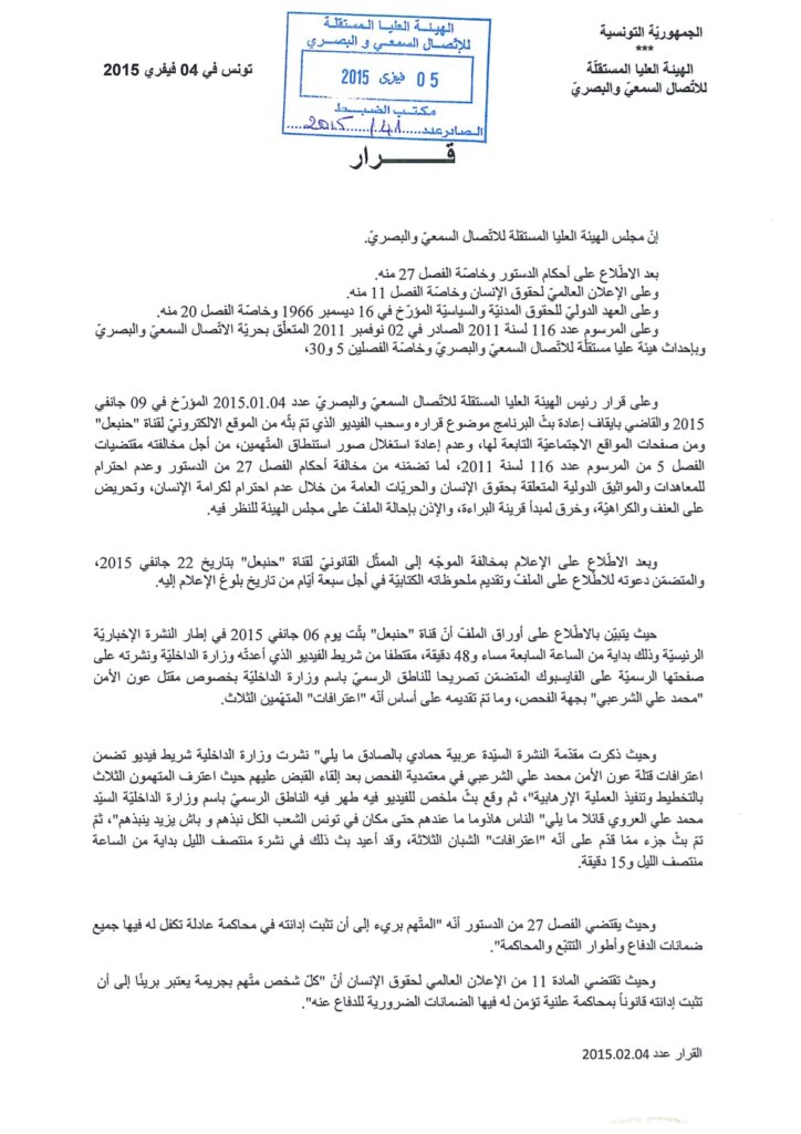 تأكيد قرار رئيس الهيئة في إيقاف إعادة بث نشرة إخبارية على قناة حنبعل لعدم احترام قرينة البراءة 04/02/2015 admin-haica by قرارات in 30/01/2026