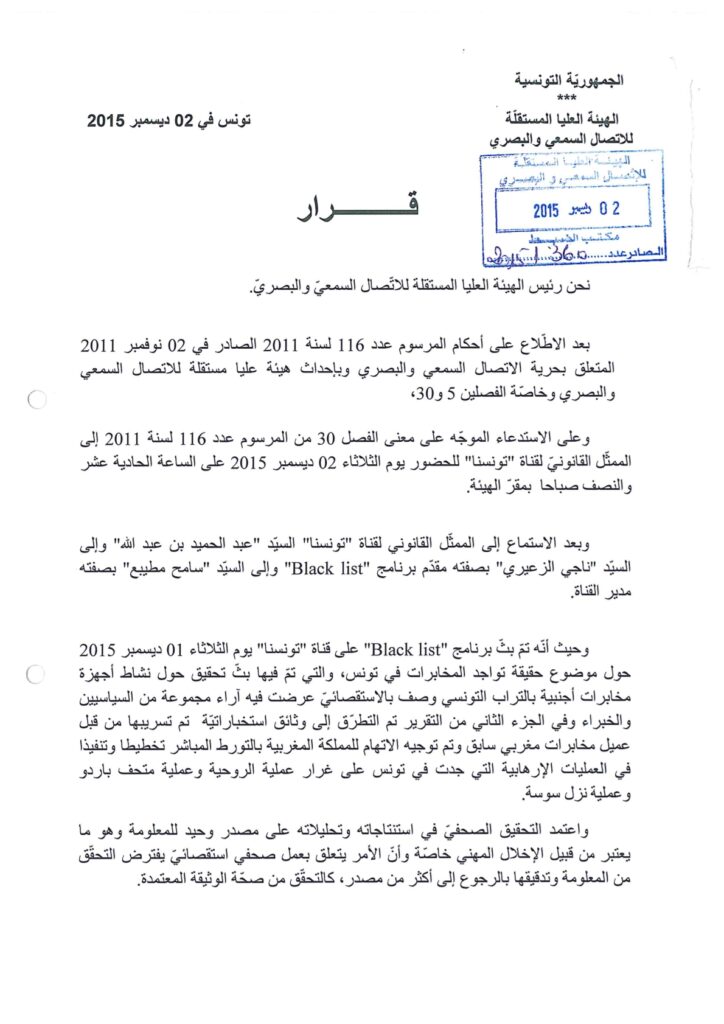 رئيس الهيئة يقرر إيقاف إعادة بث برنامج “بلاك ليست” على قناة تونسنا لتضمنه مشاهد صادمة 02/12/2015 admin-haica by قرارات in 30/01/2026