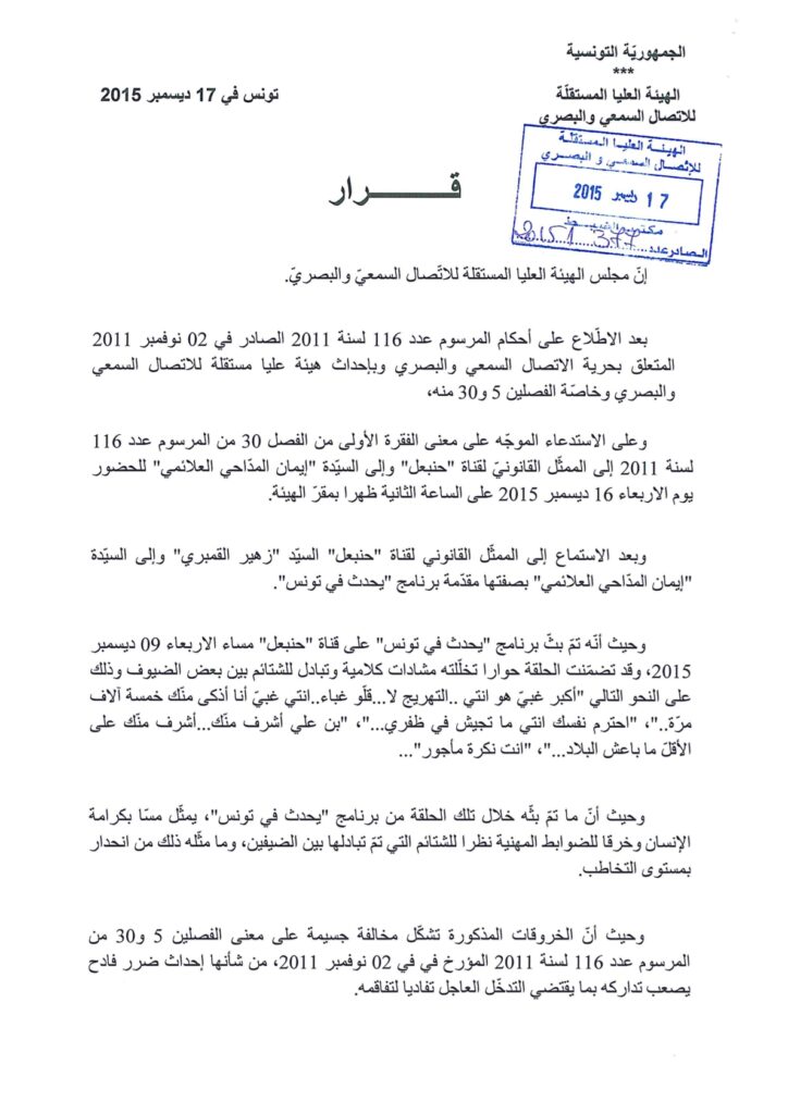 الهيئة تقرر إيقاف إعادة بث حلقة من برنامج “يحدث في تونس” على قناة حنبعل 17/12/2015 admin-haica by قرارات in 30/01/2026