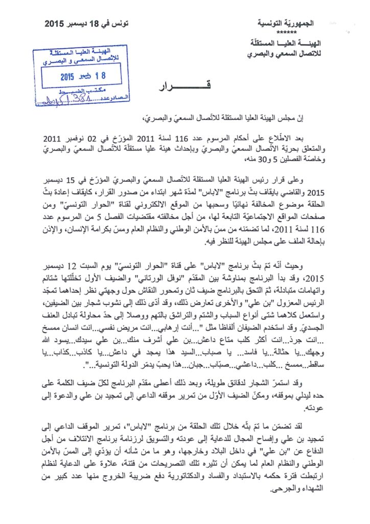 تأكيد قرار رئيس الهيئة في إيقاف إعادة بث برنامج “لاباس” لمدة شهر وإيقاف حلقة من البرنامج نهائيا على قناة الحوار التونسي 18/12/2015 admin-haica by قرارات in 30/01/2026