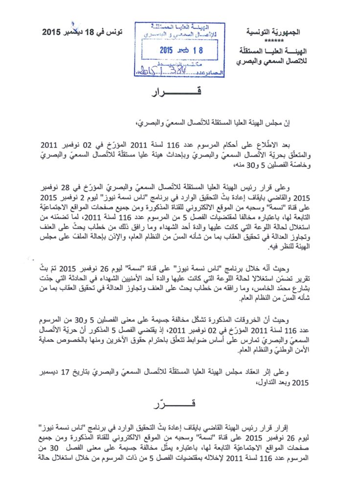 تأكيد قرار رئيس الهيئة في إيقاف إعادة بث برنامج “ناس نسمة نيوز” لإثارة البلبلة والفزع في صفوف المواطنين 18/12/2015 admin-haica by قرارات in 30/01/2026