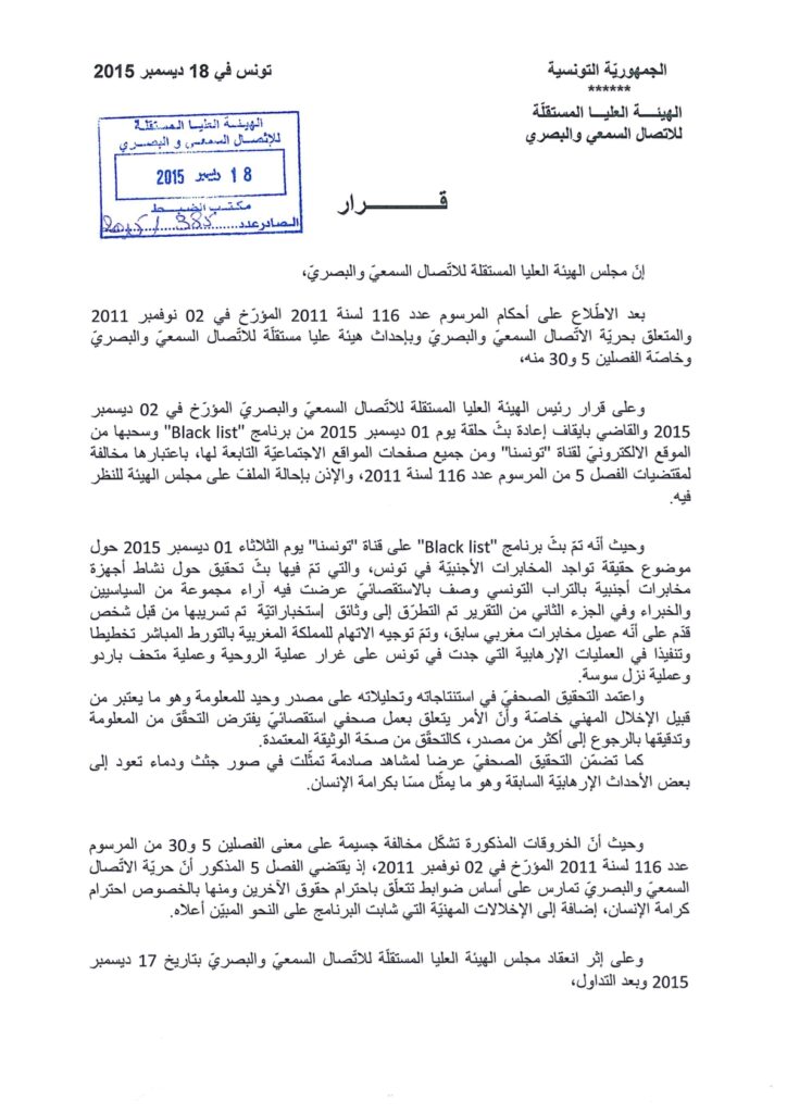 تأكيد قرار رئيس الهيئة في إيقاف إعادة بث برنامج “ملا نهار” على إذاعة شمس أف أم لإثارة البلبلة والفزع في صفوف المواطنين 18/12/2015 admin-haica by قرارات in 30/01/2026