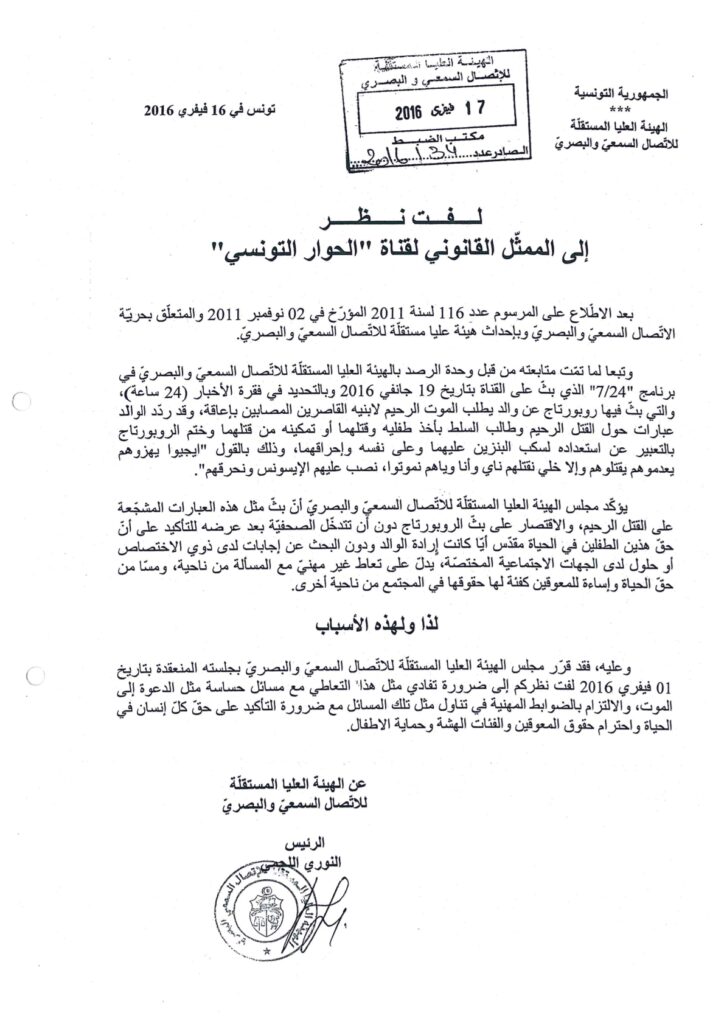 الهيئة توجه لفت نظر لقناة الحوار التونسي من أجل خرق يتعلق بالطفولة 16/02/2016 admin-haica by قرارات in 30/01/2026