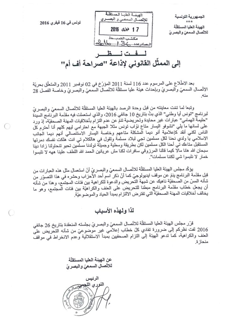 الهيئة توجه لفت نظر لإذاعة صراحة أف أم من أجل التحريض على العنف والكراهية 16/02/2016 admin-haica by قرارات in 30/01/2026