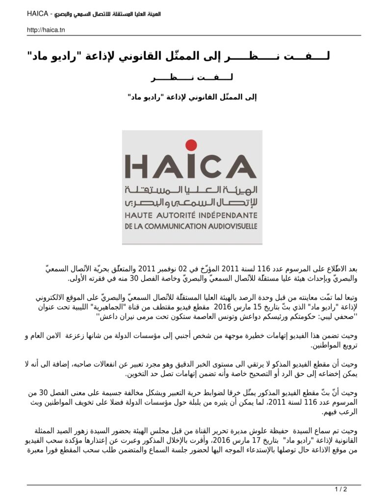 الهيئة توجه لفت نظر لراديو ماد من أجل إثارة البلبلة والفزع في صفوف المواطنين 17/03/2016 admin-haica by قرارات in 30/01/2026