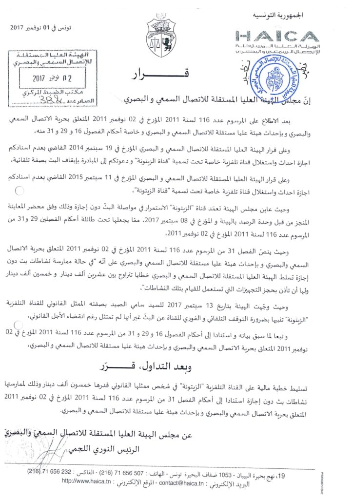 خطية مالية بـ50 ألف دينار ضد قناة الزيتونة من أجل البث دون إجازة 02/11/2017 admin-haica by قرارات in 30/01/2026