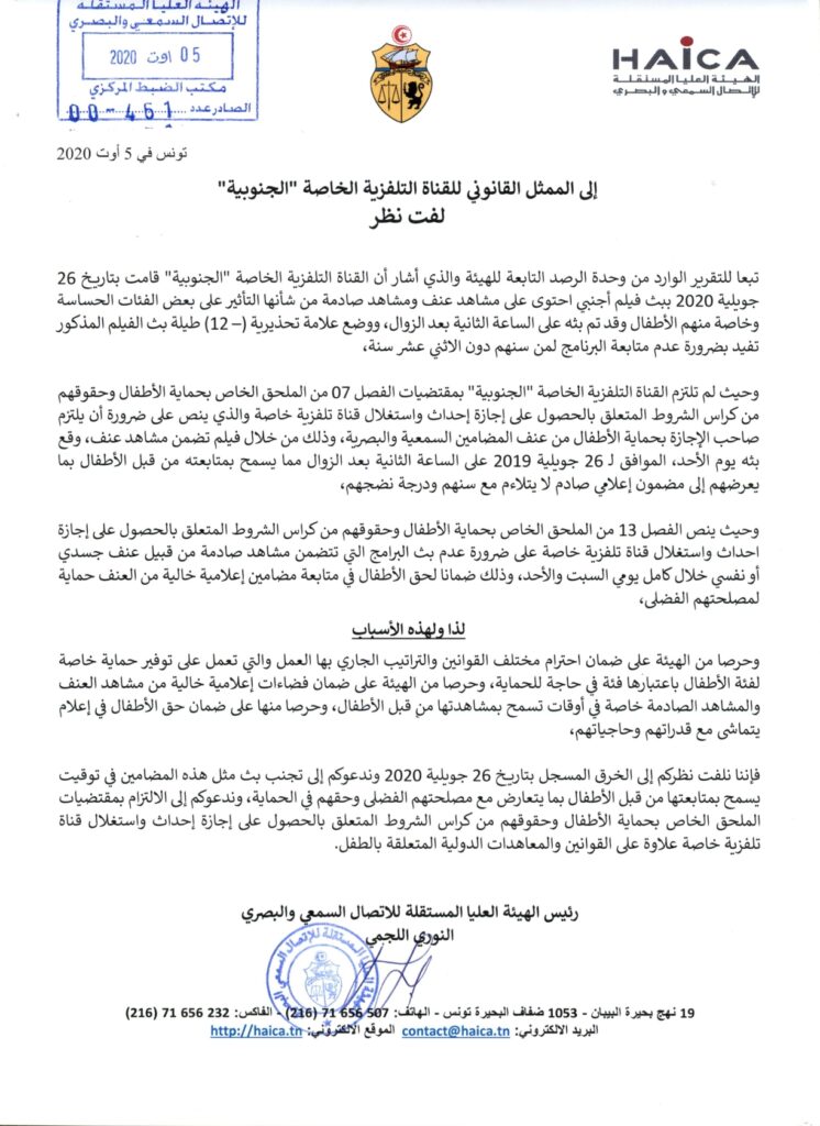 الهيئة توجه لفت نظر لقناة الجنوبية بخصوص مسلسل أجنبي من أجل خروقات تتعلق بالطفولة 05/08/2020 admin-haica by قرارات in 30/01/2026