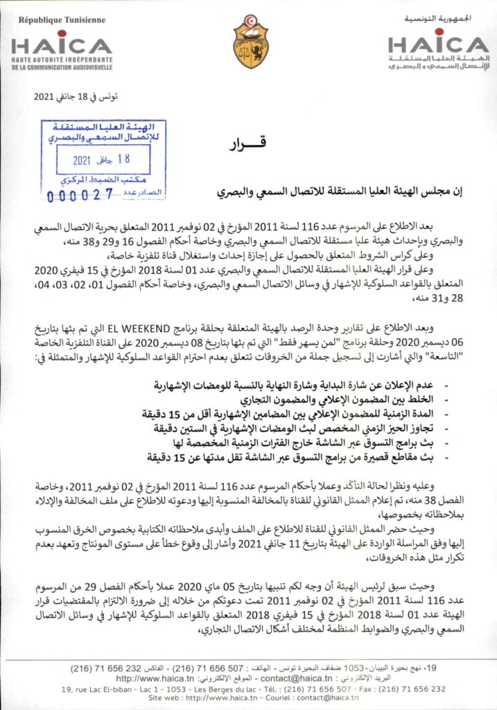 خطية مالية بـ5 آلاف دينار ضد قناة التاسعى من أجل عدم إحترام القواعد السلوكية 18/01/2021 admin-haica by قرارات in 30/01/2026