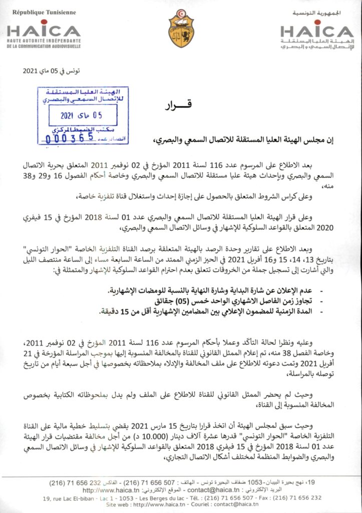 خطية مالية بـ20 ألف دينار ضد قناة الحوار التونسي من أجل عدم إحترام القواعد السلوكية 05/05/2021 admin-haica by قرارات in 30/01/2026