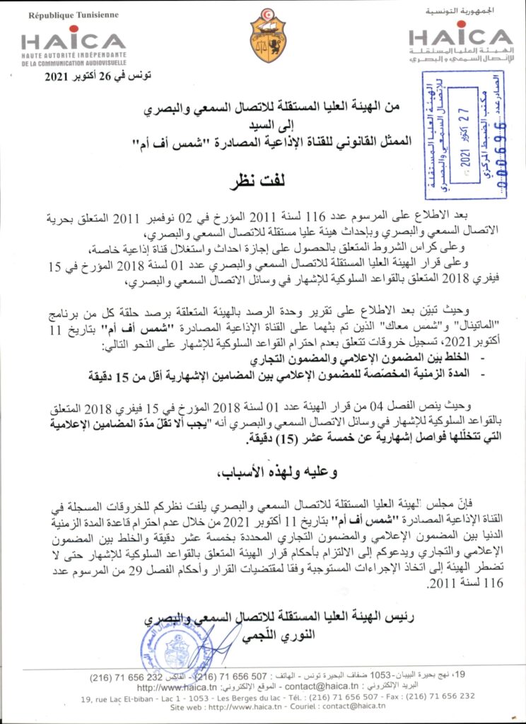 الهيئة توجه لفت نظر لإذاعة شمس أف أم من أجل عدم إحترام القواعد السلوكية 26/10/2021 admin-haica by قرارات in 30/01/2026