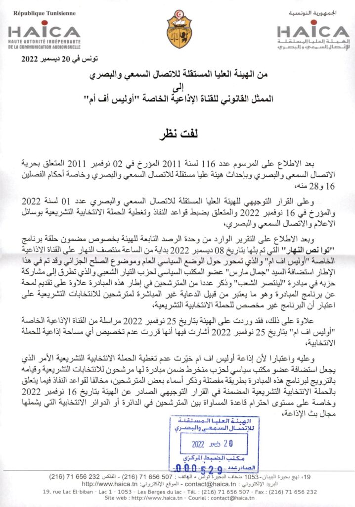 الهيئة توجه لفت نظر لإذاعة أوليس أف أم من أجل دعوة مترشحين للإنتخابات في برامج غير مخصصة 20/12/2022 admin-haica by قرارات in 30/01/2026
