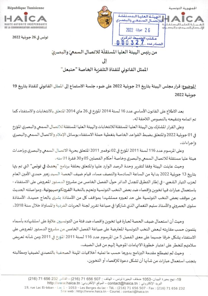 الهيئة تقرر إلزام قناة حنبعل ببث اعتذار من المشاهدين من أجل خرق يتعلق بكرامة الإنسان 26/07/2022 admin-haica by قرارات in 30/01/2026